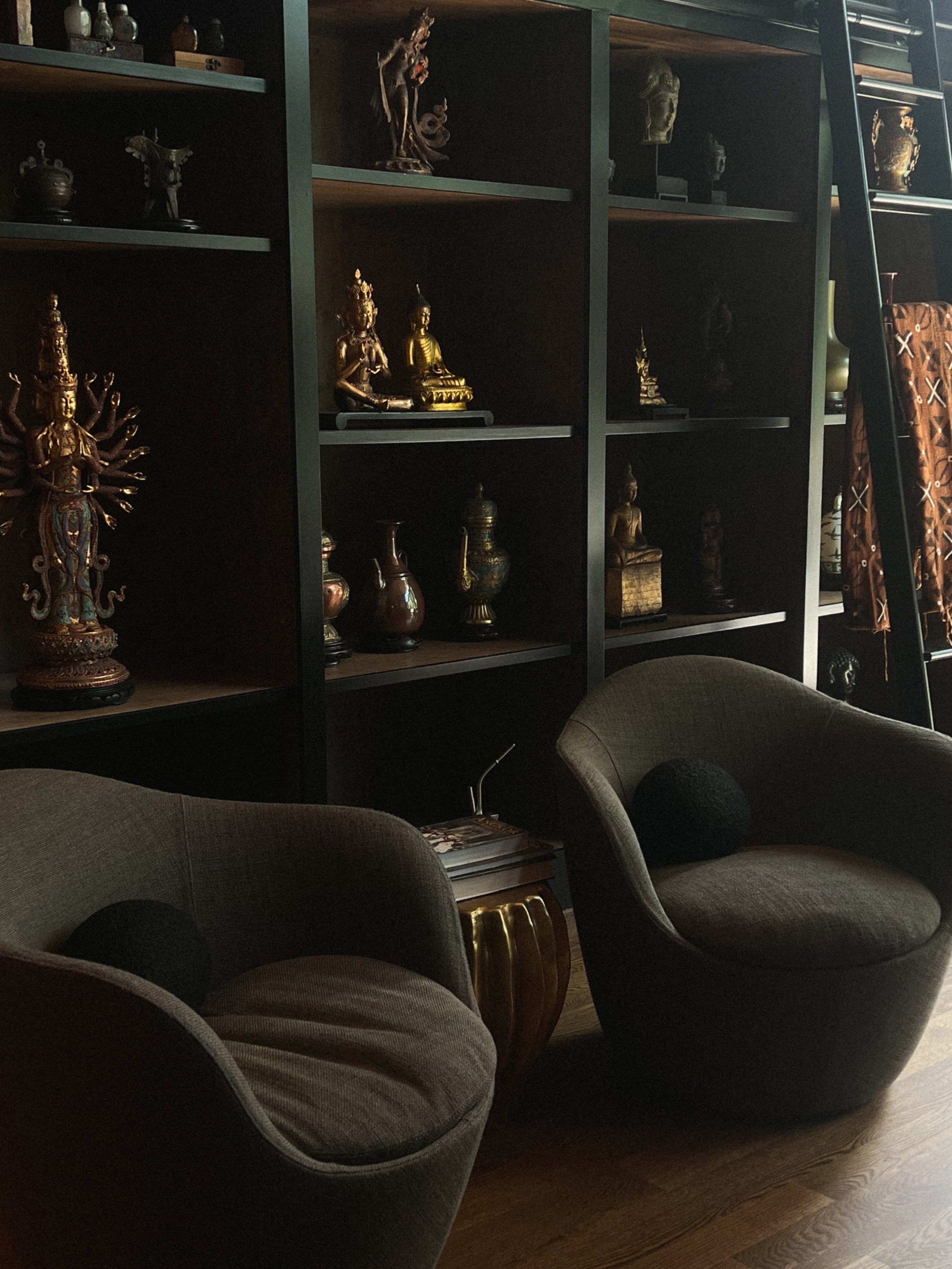 The interiors were shaped largely by the couple’s extensive travels and their collection of artwork from across Asia and Africa. Each room was designed with space for these pieces, allowing the art to guide many of the home’s colors and materials. Mossy greens echo the surrounding vegetation and nearby lagoon, while deeper tones create a warm, layered atmosphere. In contrast, the stairwell and connecting hallways are finished in a vibrant red that adds moments of visual intensity as one moves through the home.