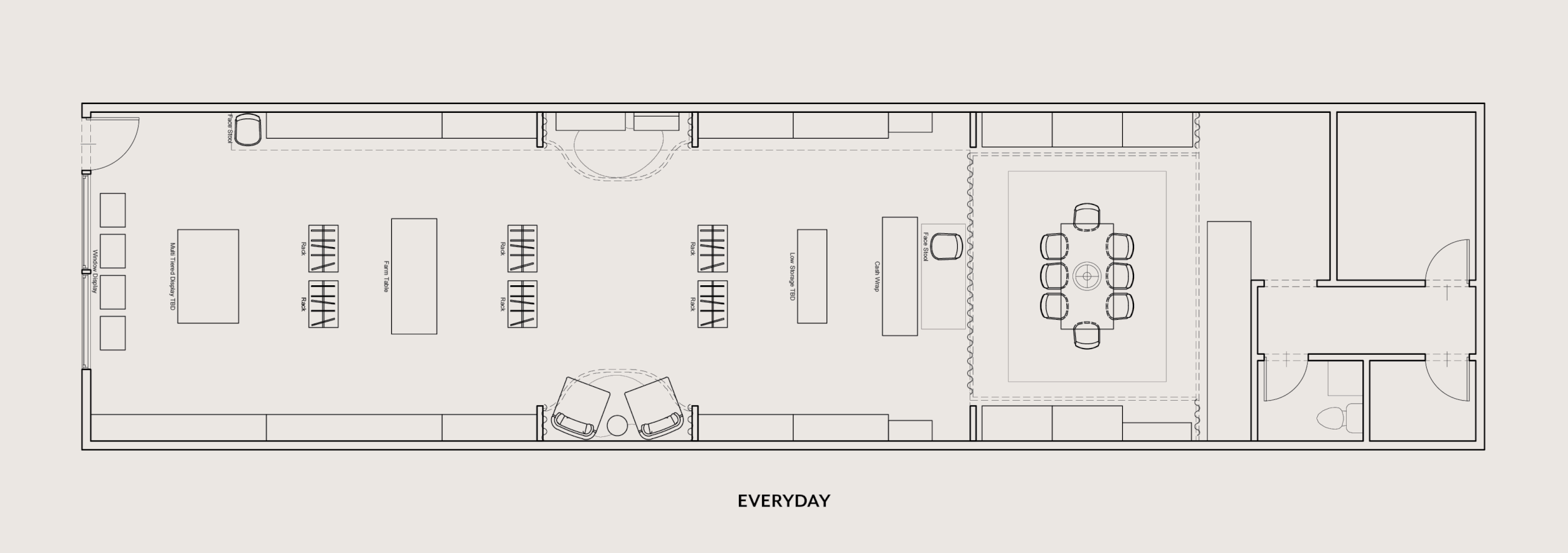 To create a back room and fitting rooms, we used a ceiling-suspended curtain track system and about 140 linear feet of hand-sewn curtains, made using one of the fabrics that Na Nin uses for their linen clothing. The wall of curtains separates the front and back of house, but can be split to open up the back room, allowing extra space for pop-up events and other times when more floor space is needed. In cases of pop-up dinners, the back room’s ample storage can be hidden behind more curtains, creating a dramatic, linen-draped dining room.