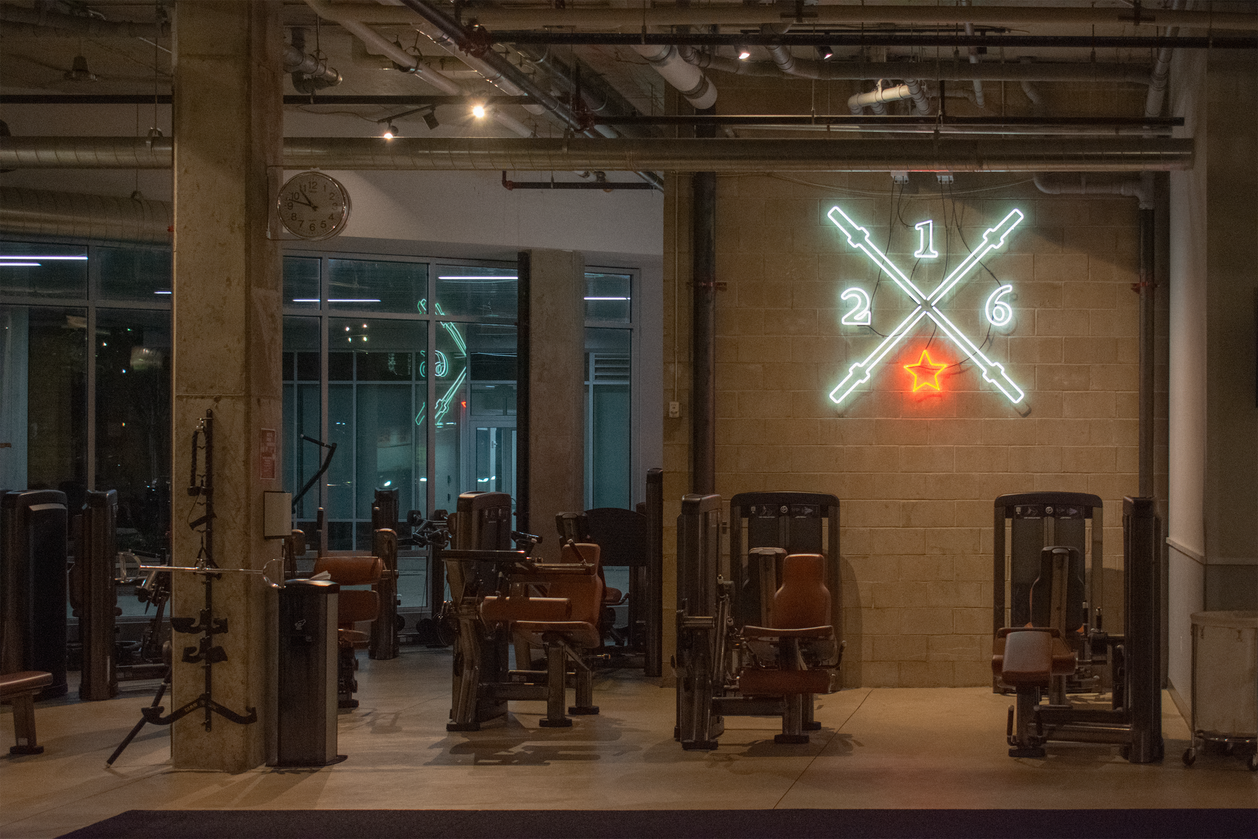 This 10,000+ square foot Cleveland gym was designed with a minimalist tone, pulling from the building’s industrial construction and the Rust Belt city’s material palette of concrete, steel, leather, and wood. Bare concrete and cinderblock walls are layered with steel decor and custom neon signage, which glow all hours of the day and lend to the gym’s street presence. Some large expanses of drywall geometric abstract murals by artist Lauren Pearce, adding levels of softness and texture to the industrial space. The original design scheme included an extensive neon design suspended from the ceiling, based on the lines and patterns on a gymnasium floor (below.)
